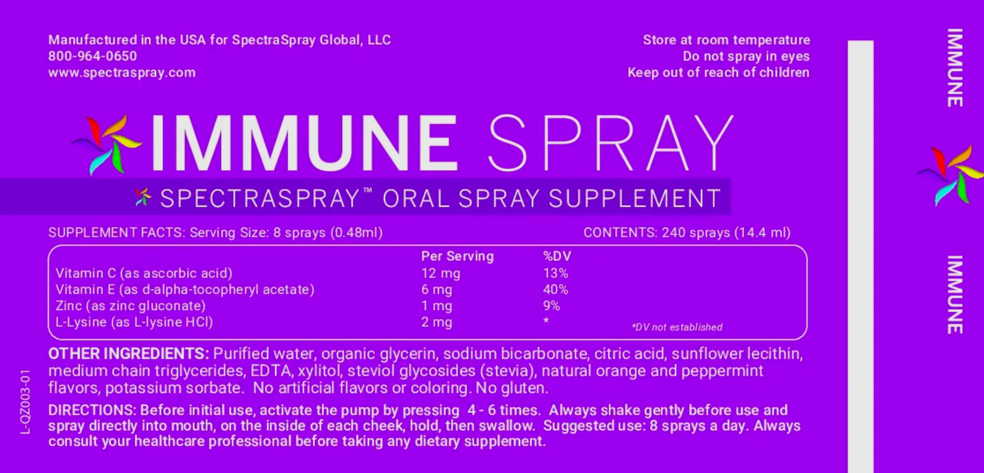 SpectraSpray Immune Spray is an easy to use VEGETARIAN ORAL supplement spray with superior 93% absorption; highest available in any vitamin. A unique blend of effective ingredients including Vitamin C, D3, Zinc and Lysine; helps your system stay strong to fight off invading viruses and bacteria. Helps provide a boost to a flagging immune system. Recommended for travel immunity support. Bariatric patient friendly. 30 servings.