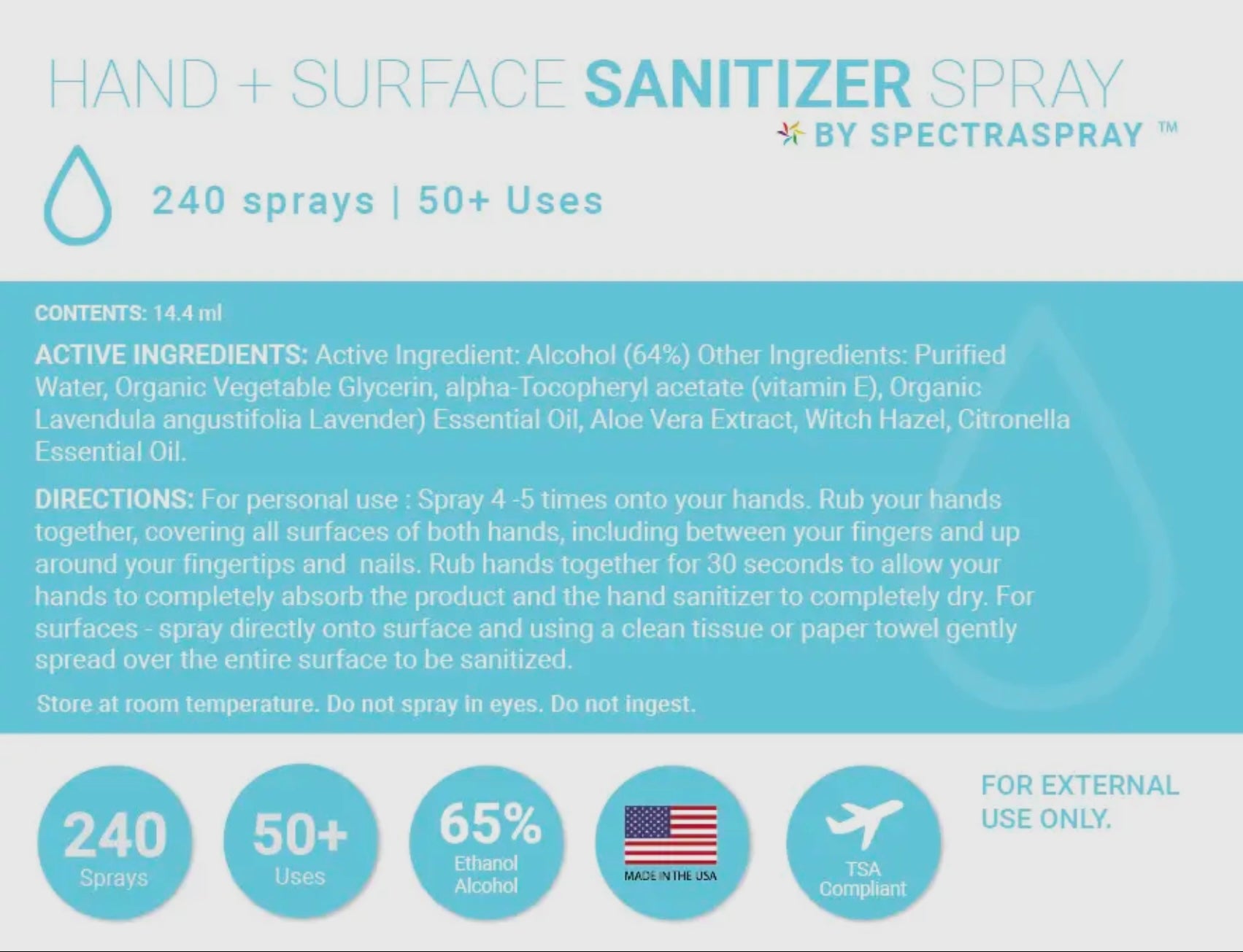 Hand & Surface sanitizer: 65% alcohol - follows strict CDC guidelines for alcohol content to provide effective elimination of bacteria & viruses on skin and hard surfaces. Moisturizes with Aloe Vera, Glycerin & Vit E. No dry hands. Ideal for travel. Convenient to carry in handbag, briefcase or pocket. TSA Approved size. Pleasant smelling with citronella and lavender. Container is airtight & lightproof - will NOT leak! FOR TOPICAL/EXTERNAL USE ONLY. 50 uses!