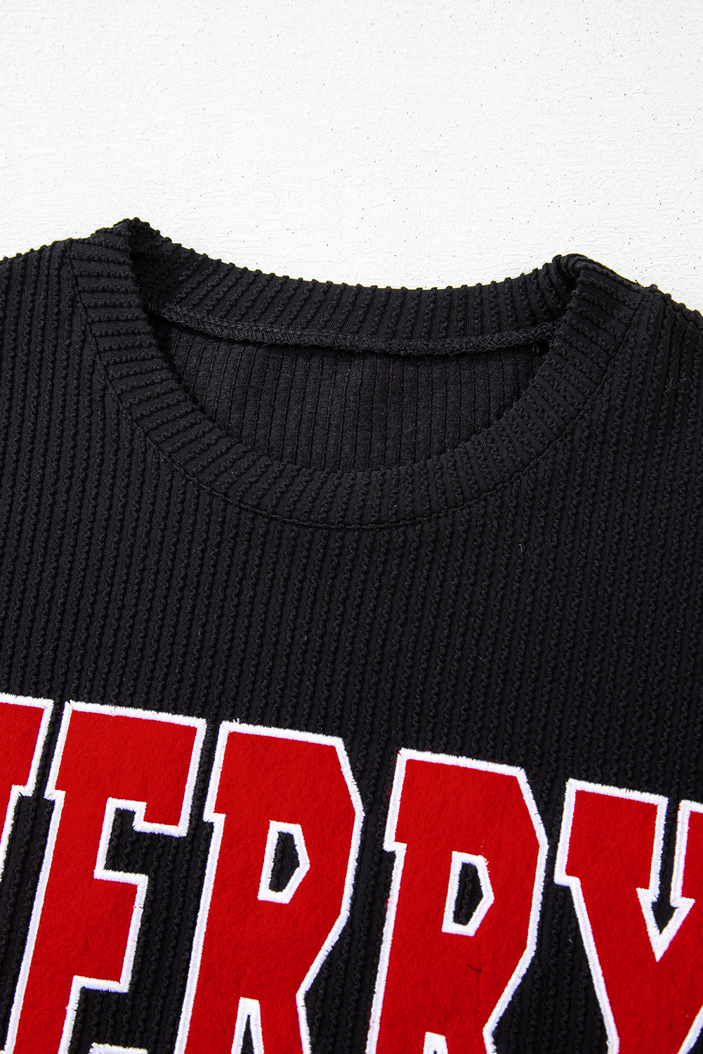 Black Corded MERRY Long Sleeve Top and Shorts Pajama Set