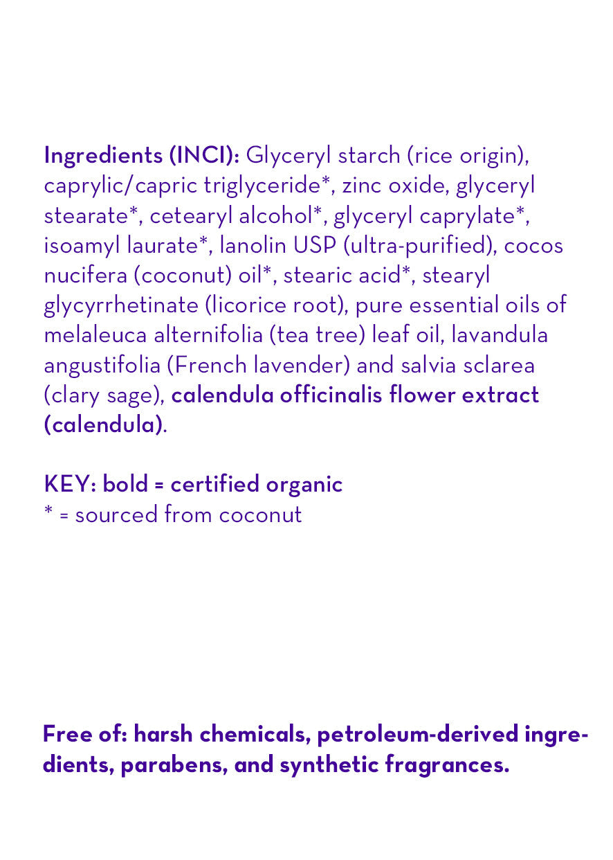 Plant-based emollients, pure organic calendula extract, coconut oil, and zinc oxide all work in harmony to revitalize, soothe, and improve the appearance of irritated skin.