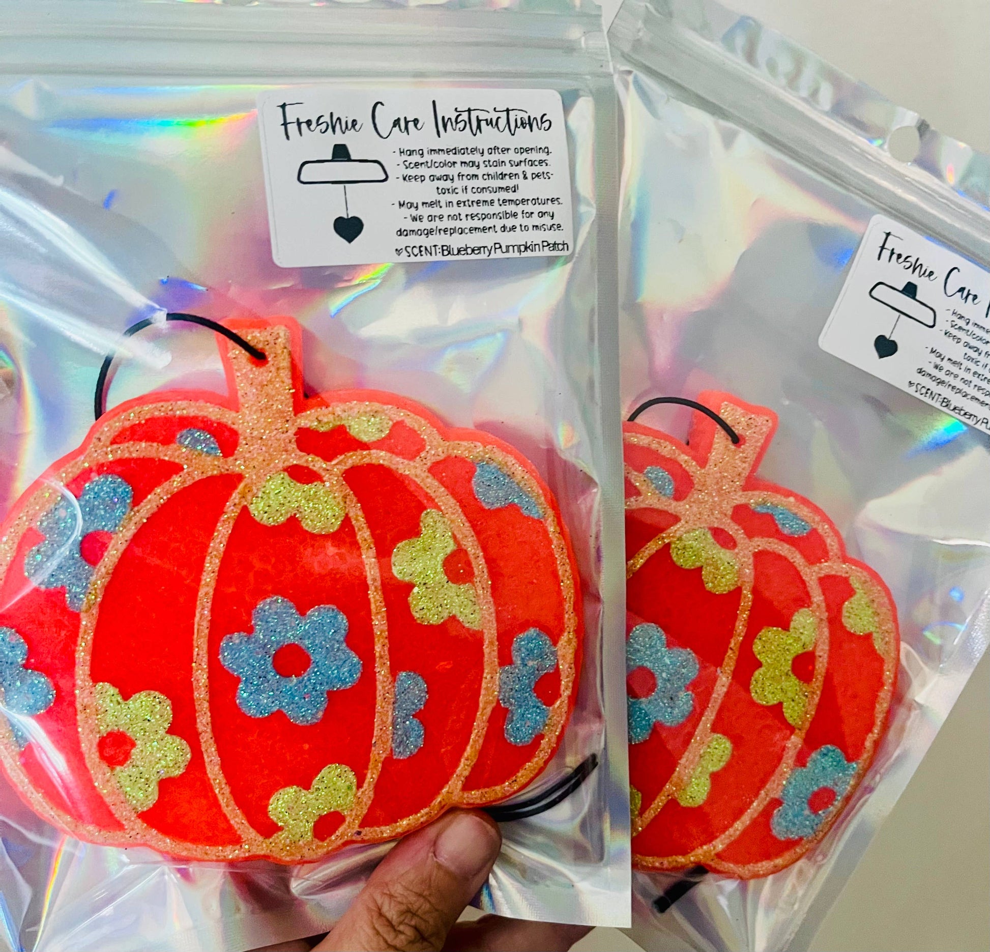 Car Air Freshener, Hung on elastic string and packaged in holographic silver smell proof bag providing long shelf life. Colors as shown, will ship in a variety of pink, orange and teal pumpkins. Scents will be variety mix of our most popular and when applicable, seasonally appropriate scents.