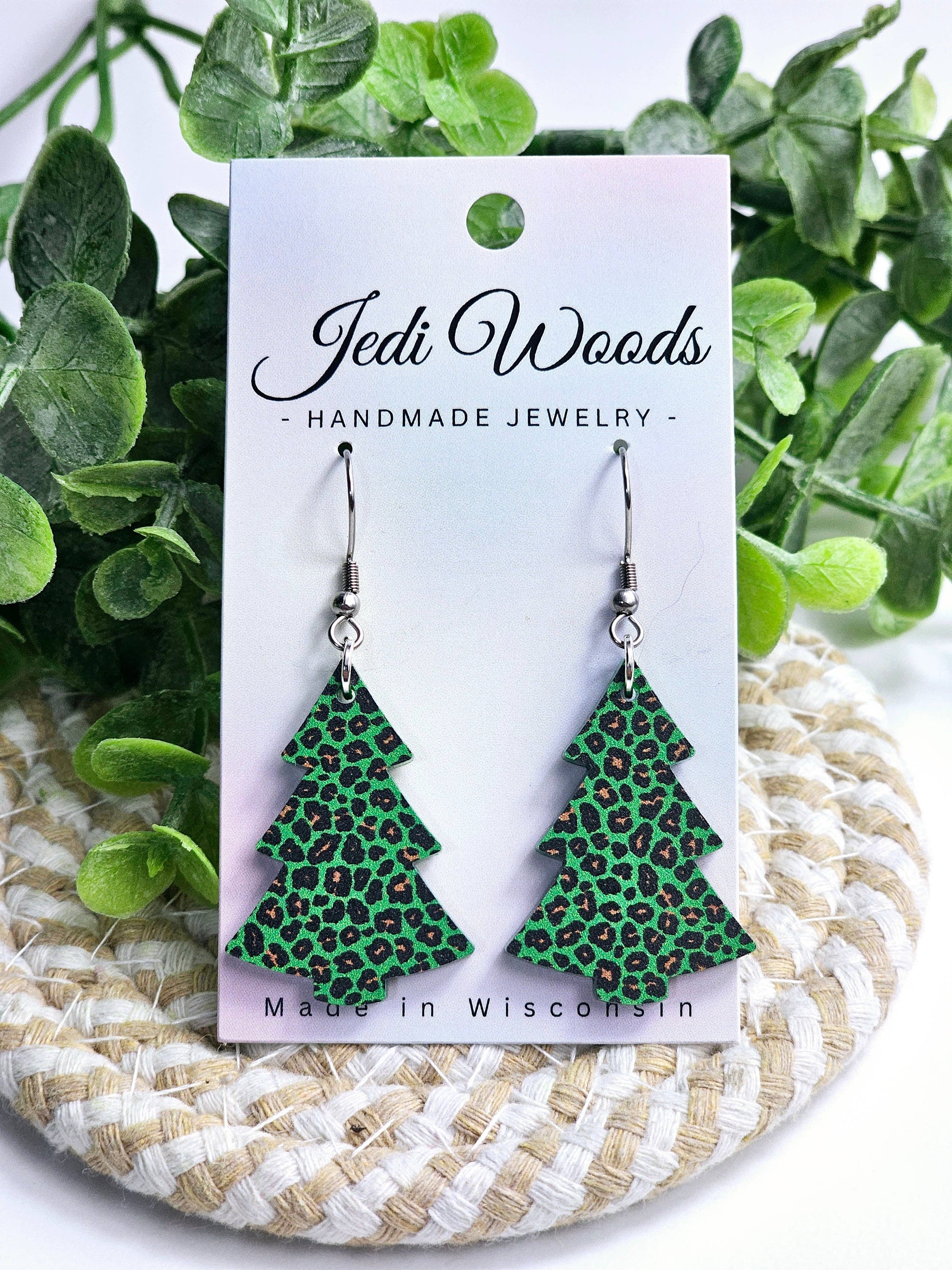 Green Leopard Christmas Tree Earrings