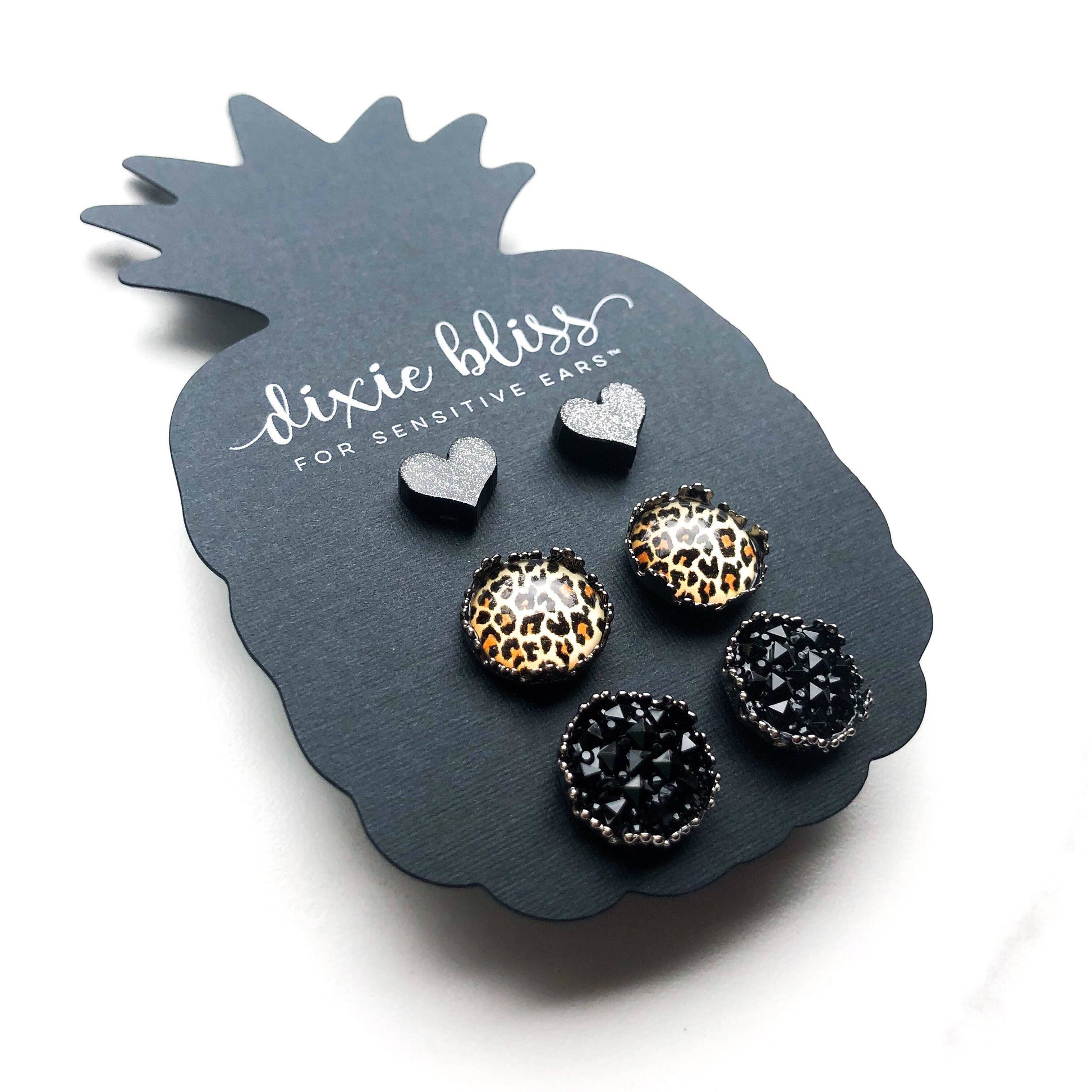 Josephine features: *9mm Black Glitter Acrylic Heart *12mm Amber Cheetah Photo Glass in a Gunmetal-toned Crown Setting *12mm Black Diamonds in a Gunmetal-toned Crown Setting *Gunmetal-toned setting and setting post are lead-free and nickel-free brass *Other posts in this trio are hypoallergenic surgical stainless steel *Great for sensitive ears *Made in the USA Fans of leopard, animal prints will love! Perfect for everyday wear or #Valentines !