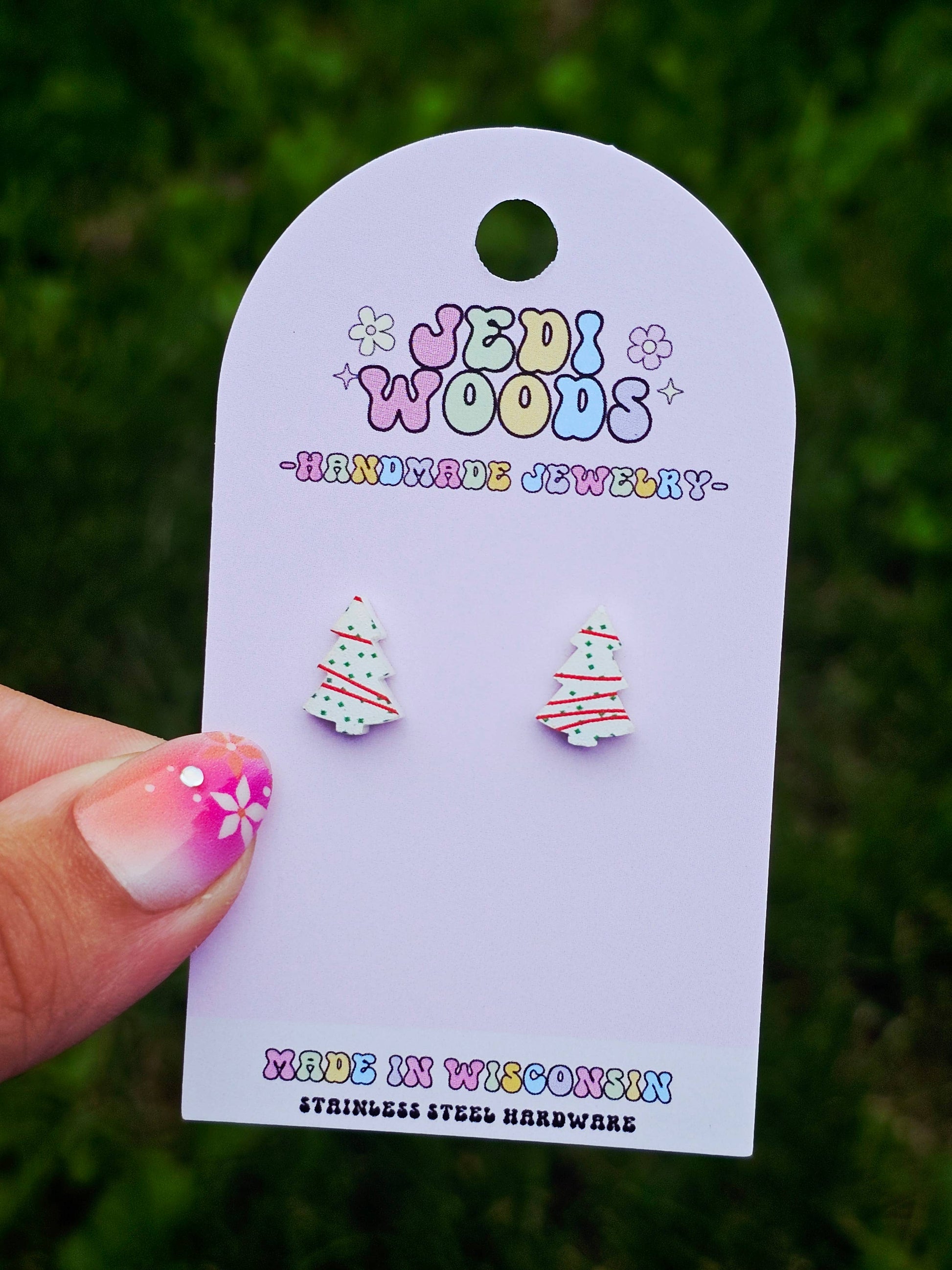 Handmade and hand assembled stud/post earrings made in Green Bay, Wisconsin. Inspired by the little Debbie christmas cakes, we give you Lil Debbie cake stud earrings! With a layer of frosting and sprinkles on top of top tier white acrylic, these little delights are perfect for the holiday season and a constantly sold product that is easy to recognize!