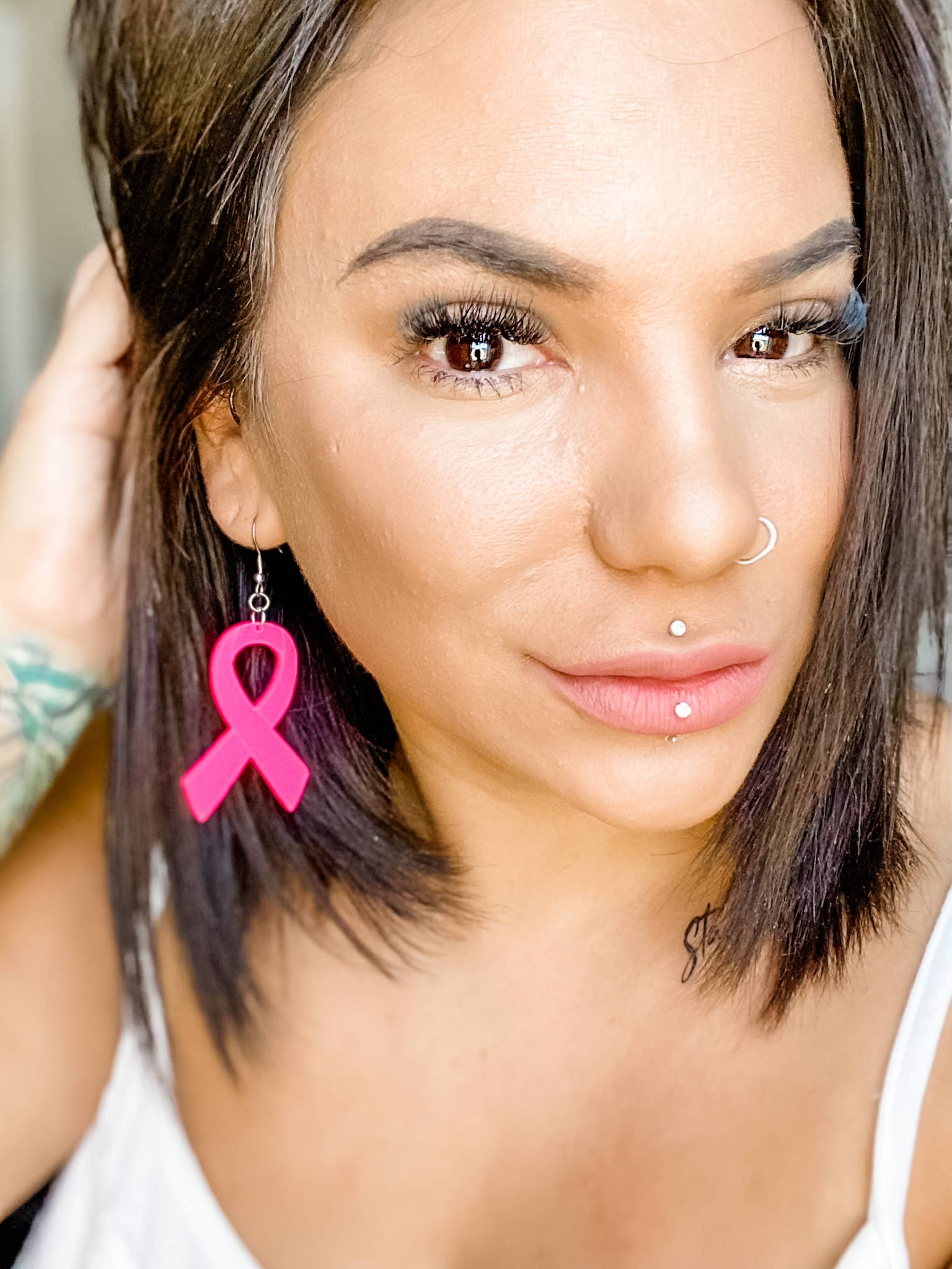 Our Pink Ribbon for Breast Cancer Awareness features: *Hot Pink Glossy Acrylic *Ribbon measures 3.1" from top of hook *Hooks are Stainless Steel *Lightweight *Great for sensitive ears *Made in the USA Always wear rubber backs with dangle style earrings