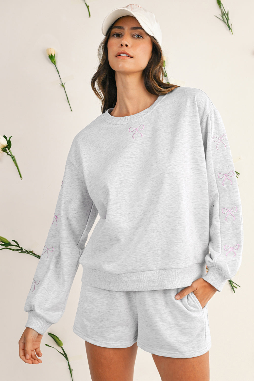 Sachet Pink Bow Embroidery Long Sleeve Pullover and High Waist Shorts Set